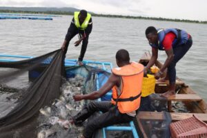 1, 2 tonne de poissons sortis de la première cage flottante, c’est le résultat du premier test de la pisciculture en cage flottante sur le barrage de Samendeni dans le cadre de l’initiative présidentielle pour la production agricole et l’autosuffisance alimentaire (IP-P3A).